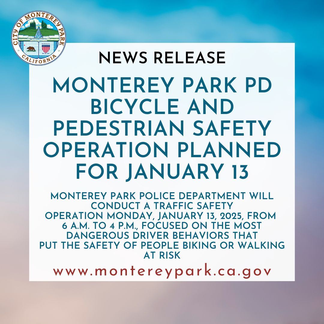 Monterey Park Police Department will conduct a traffic safety operation Monday, January 13, 2025, from 6 a.m. to 4 p.m., focused on the most dangerous driver behaviors that put the safety of people biking or walking at risk.