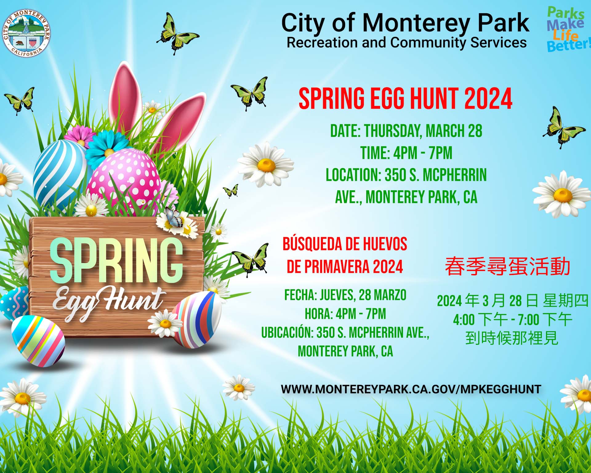 Let the hunt begin! On Thursday, March 28, 2024, from 4–7 p.m., the City of Monterey Park Recreation and Community Services Department will host the MPK Spring Egg Hunt at Barnes Park. Attendees will enjoy free carnival games, pictures with Peter Rabbit and massive age group egg hunts.
