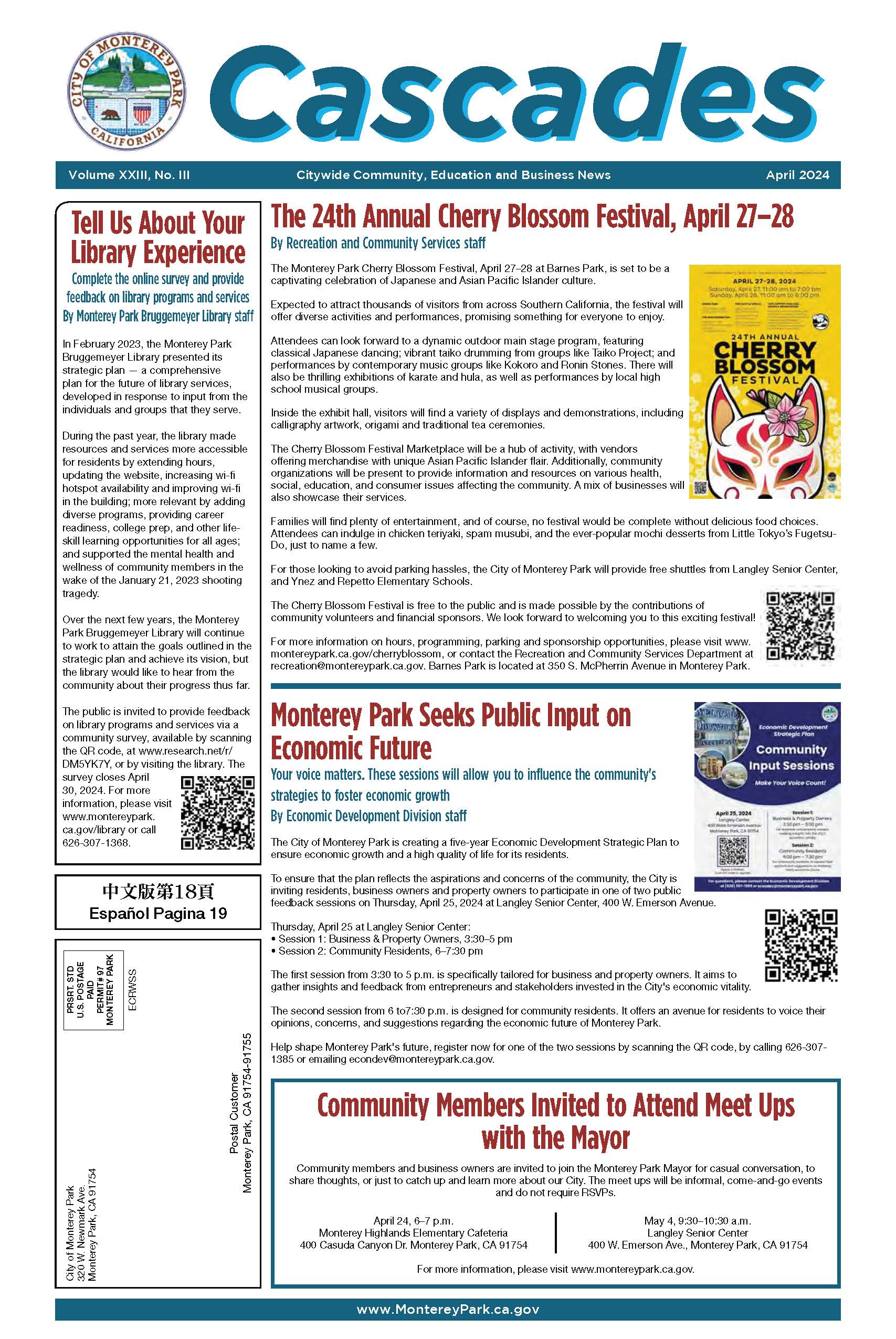 Download the latest issue of the Cascades for municipal, educational and regional government events and activities for the Monterey Park community.