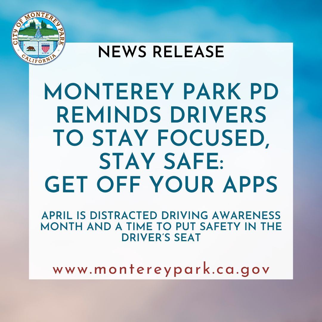 April is Distracted Driving Awareness Month and a time to put safety in the driver’s seat. Monterey Park Police Department will be actively looking for drivers throughout the month who are in violation of the state’s hands-free cell phone law.