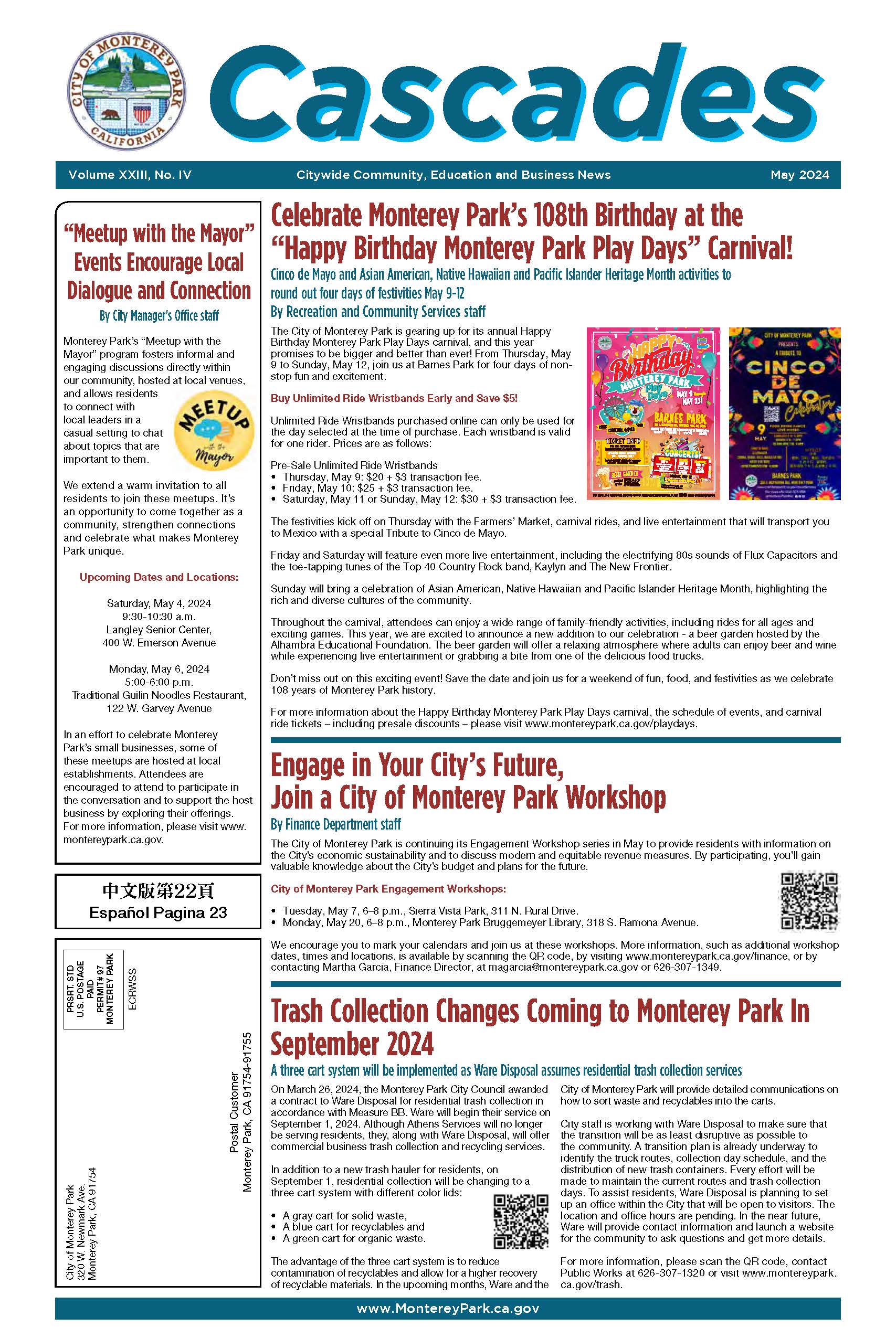 Download the latest issue of the Cascades for municipal, educational and regional government events and activities for the Monterey Park community.